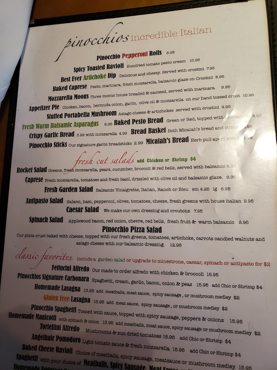 Welcome to Pinocchios Casual Italian, a charming gem nestled in Loveland, Colorado. Known for its inviting atmosphere and hearty Italian fare, this restaurant offers a delightful escape for casual dining enthusiasts. When you step inside, you're greeted by a friendly staff that adds warmth to your dining experience.